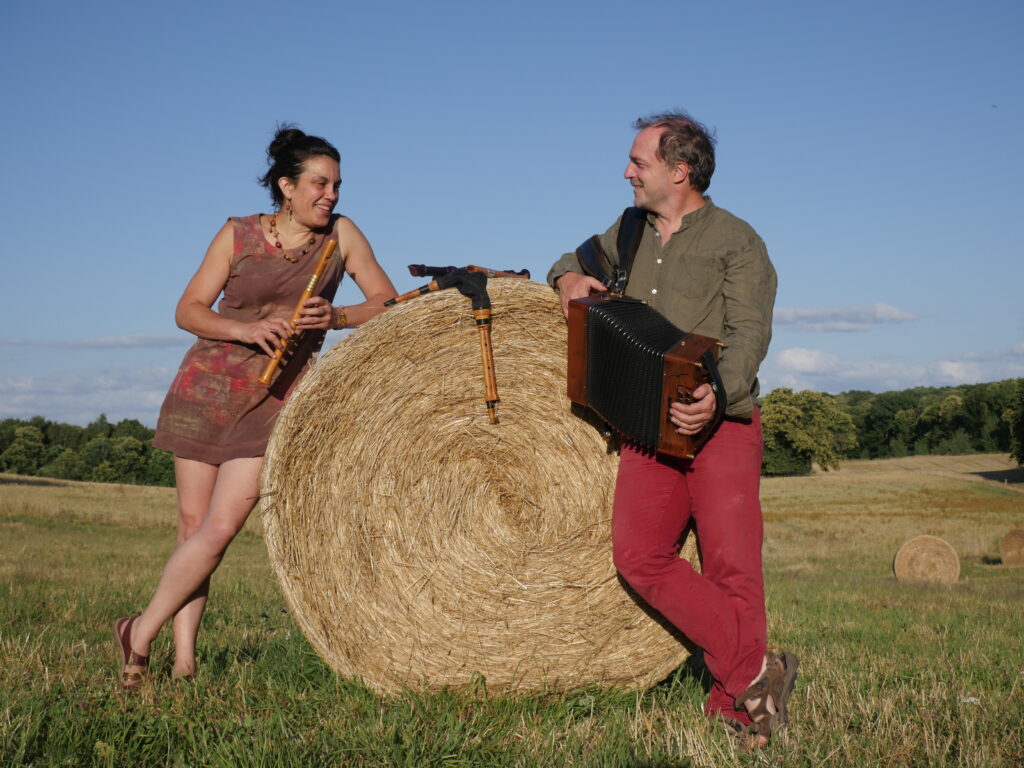 Avec eux, la musique est avant tout faite pour danser. Plus de vingt ans de complicité sur scène et dans la vie se ressentent dans leur proposition artistique : mélodies à l’unisson, bourdons rythmiques, arrangements subtils et une palette d’instruments qui s’entremêlent — accordéon, flûte essentiellement, mais également boha ( cornemuse des landes de Gascogne), tun-tun, percussions, et chant.